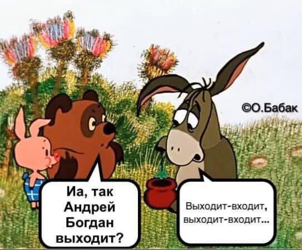 На одній із них зображено кадр відомого мультфільму про пригоди Вінні-Пуха. Головний герой мультика цікавиться у сумного ослика Іа, чи виходить Андрій Богдан, на що той відповідає своєю знаменитою фразою: "Входить і виходить ...".
