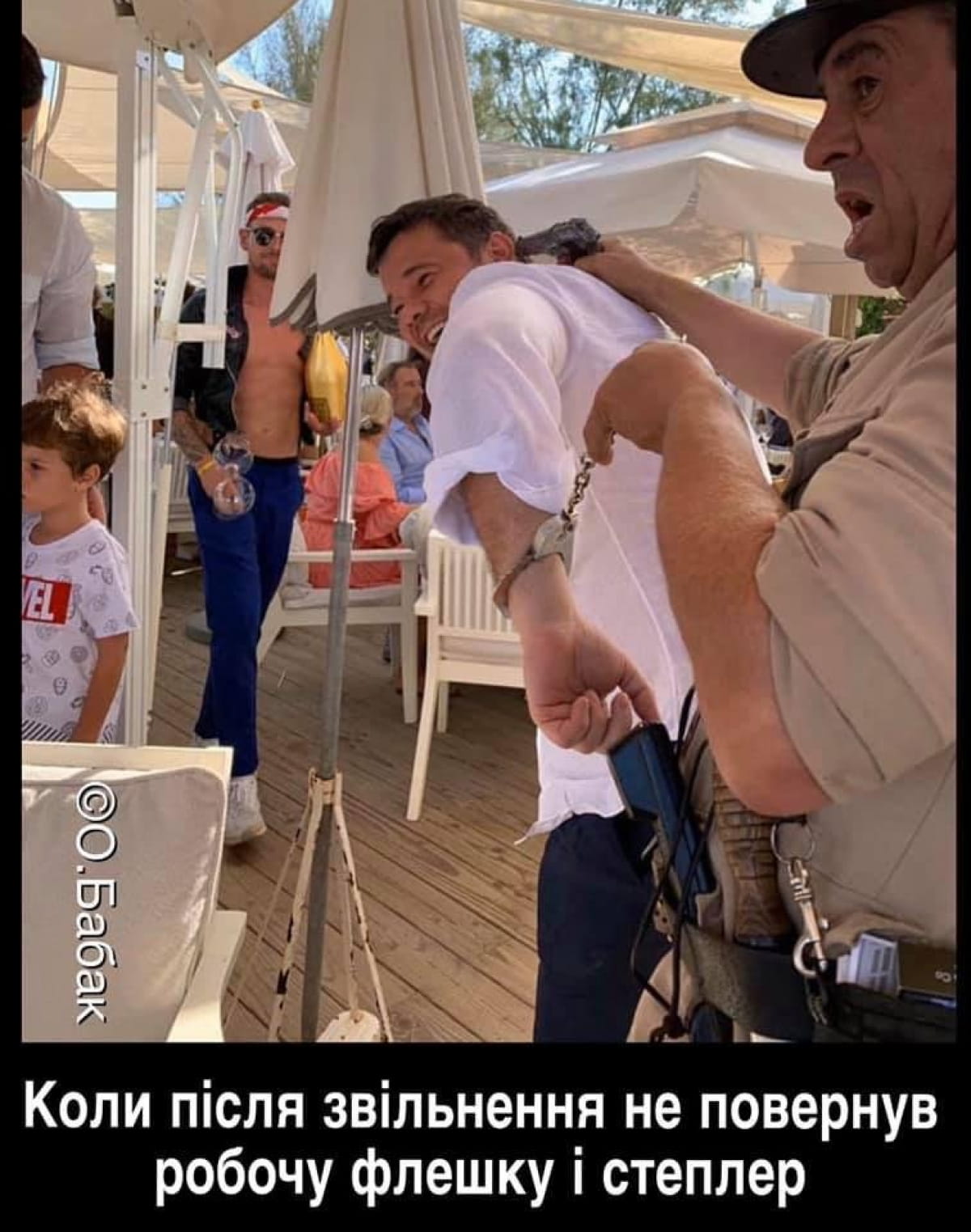 Ще одна картинка зображує жартівливий арешт Андрія Богдана американським "шерифом". "Коли після звільнення не повернув робочу флешку і степлер", – йдеться в підписі під фото.