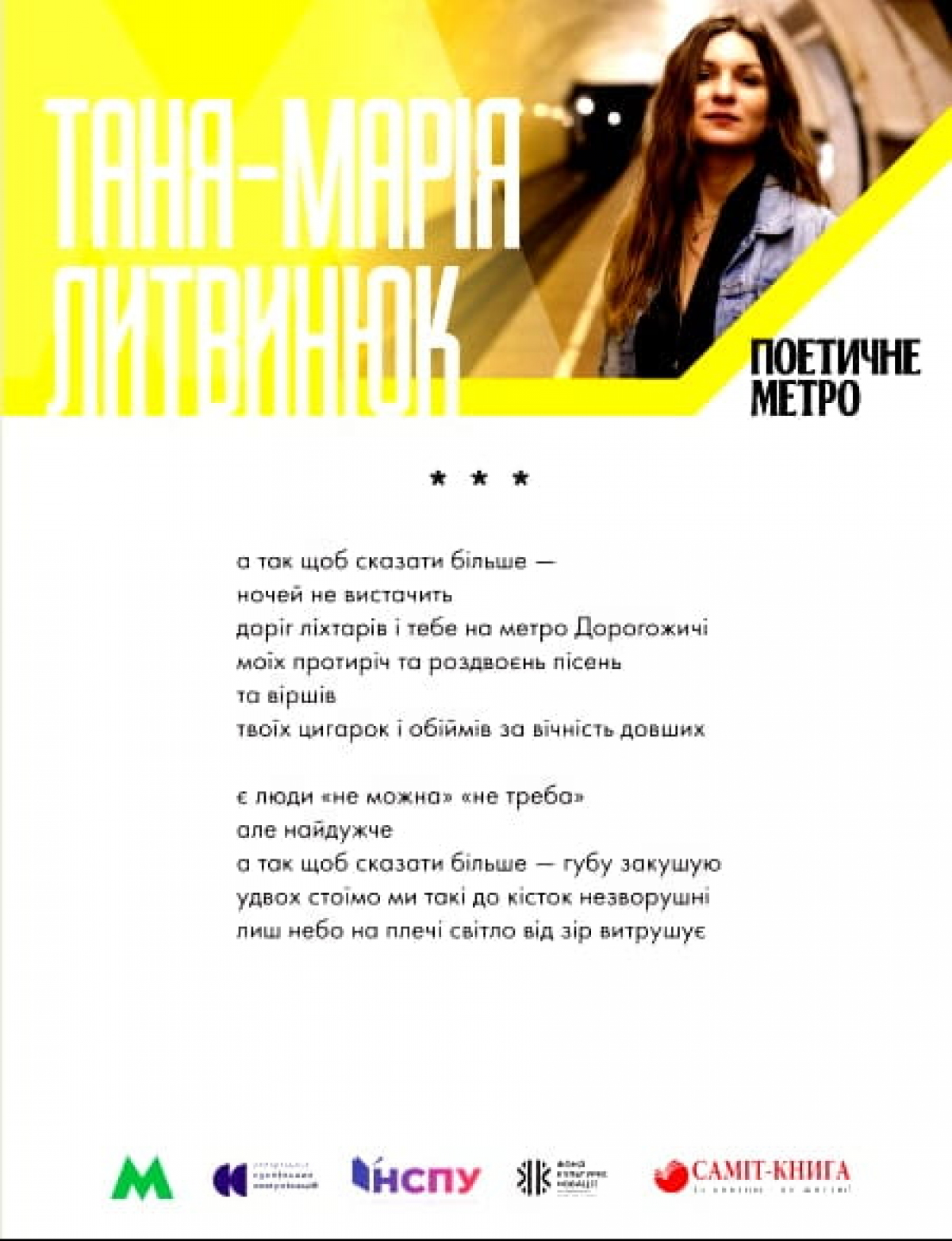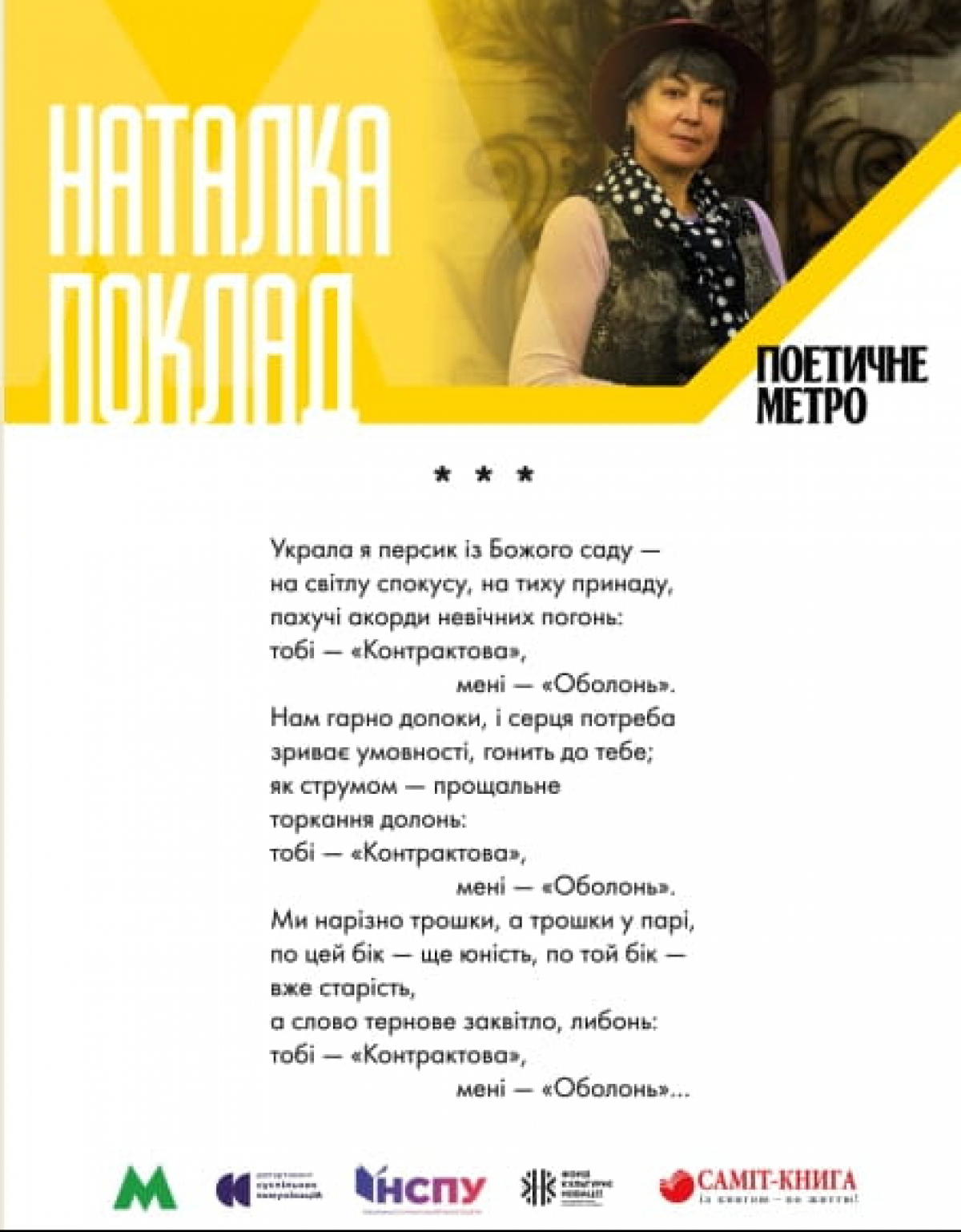 У київському метрополітені з'явилися плакати із віршами сучасних українських письменників. Про це повідомляє "Дивогляд" із посиланям на Національну спілку письменників України.