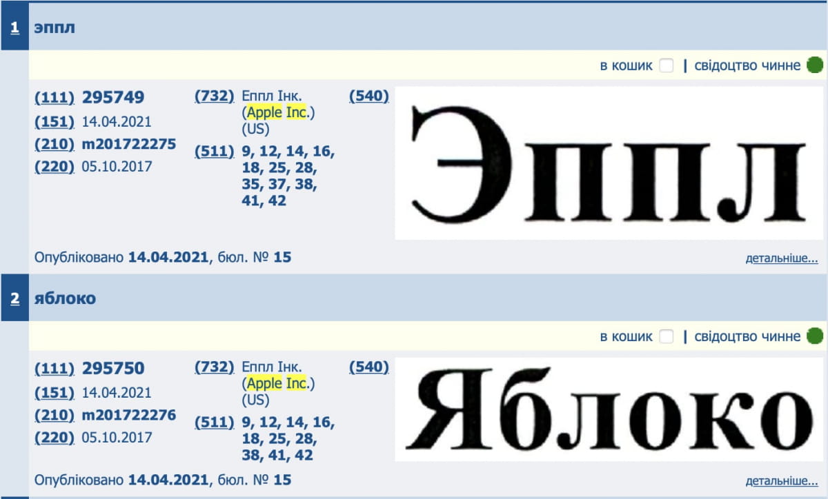 У середу, 14 квітня, представник компанії Руслан Дробязко зареєстрував такі марки, як "Эппл" та "Яблоко". Відтепер на рахунку Apple їх налічується 31.