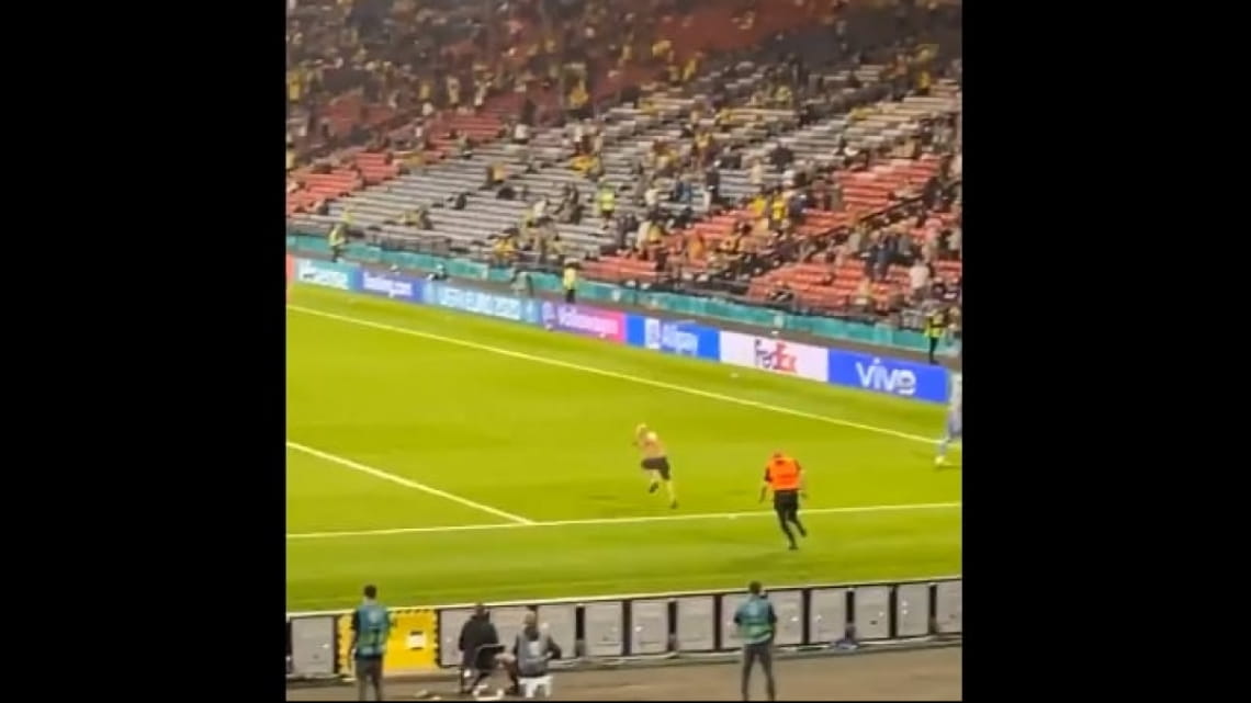 У мережі з’явилося курйозне відео, на якому видно, як чоловік, оголений по пояс, робить обманні маневри, щоб втекти від працівників стадіону, і біжить до українських футболістів.