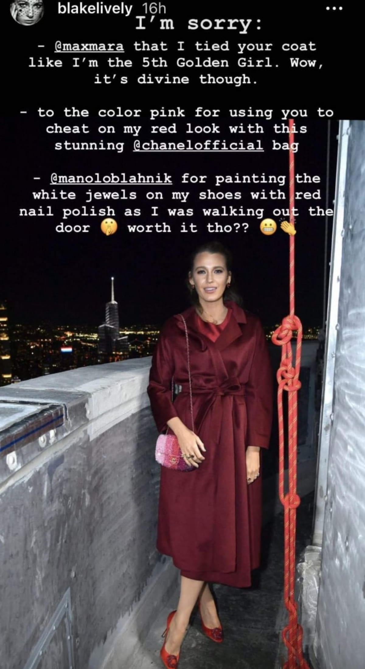 У вівторок, 9 листопада, в Empire State Building у Нью-Йорку відбувся урочистий захід, який не пропустила і Блейк Лайвлі. Для цієї події жінка обрала коротку червону сукню бренду Georges Chakra, пальто, що прикривало коліна (Max Mara) та червоні туфлі (Manolo Blahnik Hangisi). Зокрема, увагу багатьох прикував до себе останній елемент наряду.