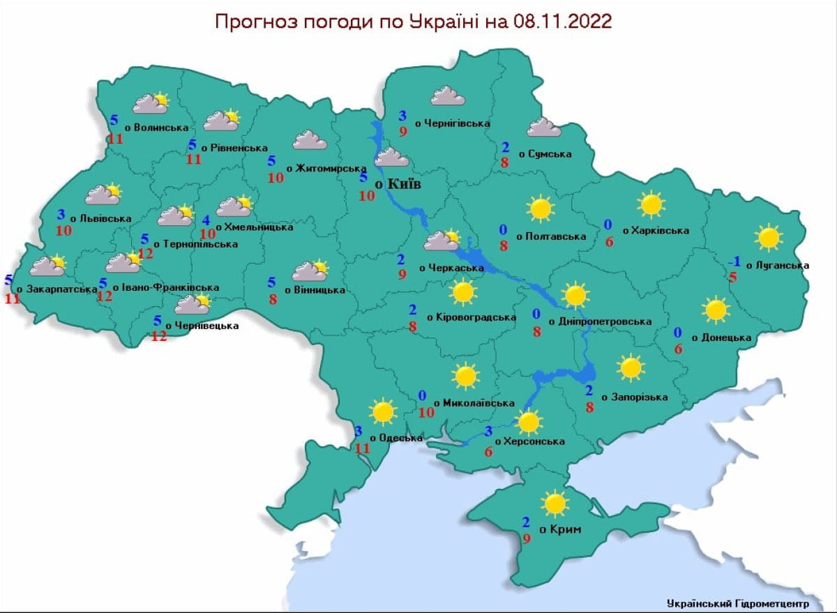 Мінімально користуватися додатковими джерелами тепла (навіть рекомендується знизити їх використання) варто мешканцям західних областей – там 8 листопада очікується +10+14 градусів. На інших територіях у вівторок вдень на стовпчиках термометрів буде +9+13 градусів.
