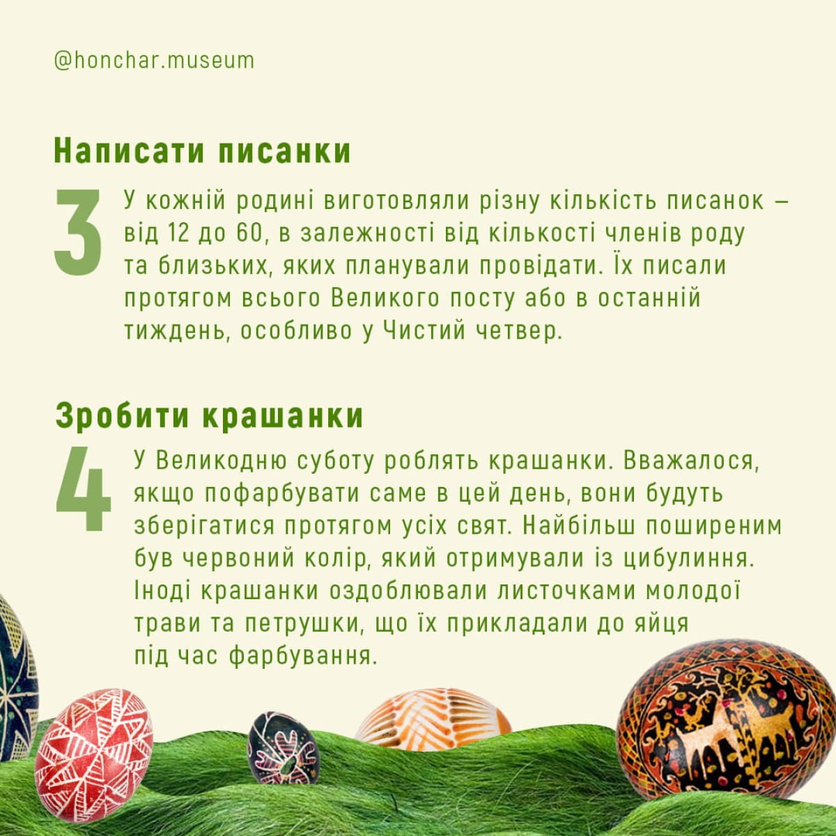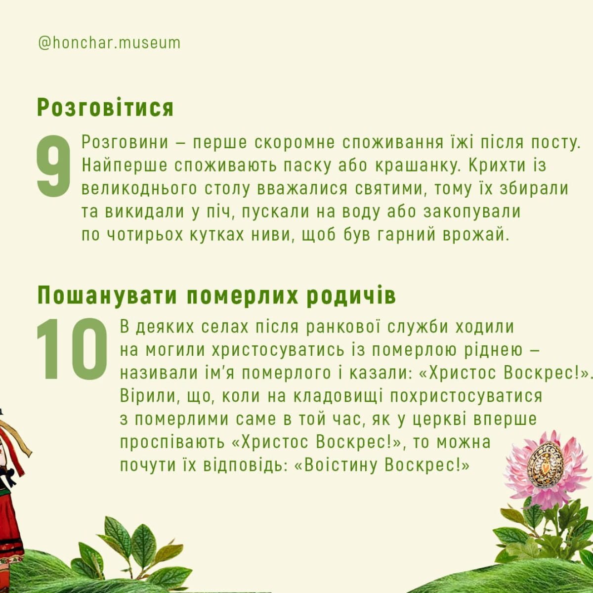 У Музеї Івана Гончара розповіли про 11 головних традицій українського Великодня, пов'язаних із певними діями. Про це повідомляє "Дивогляд" із посиланням на Facebook музею.