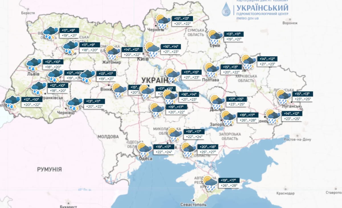 Синоптики прогнозують упродовж дня негоду і попереджають про шквальний вітер, штормові дощі та навіть град. Середня температура повітря вдень коливатиметься від +18 до +28°С. Пориви вітру по всій території України сягатимуть 7-12 м/с.