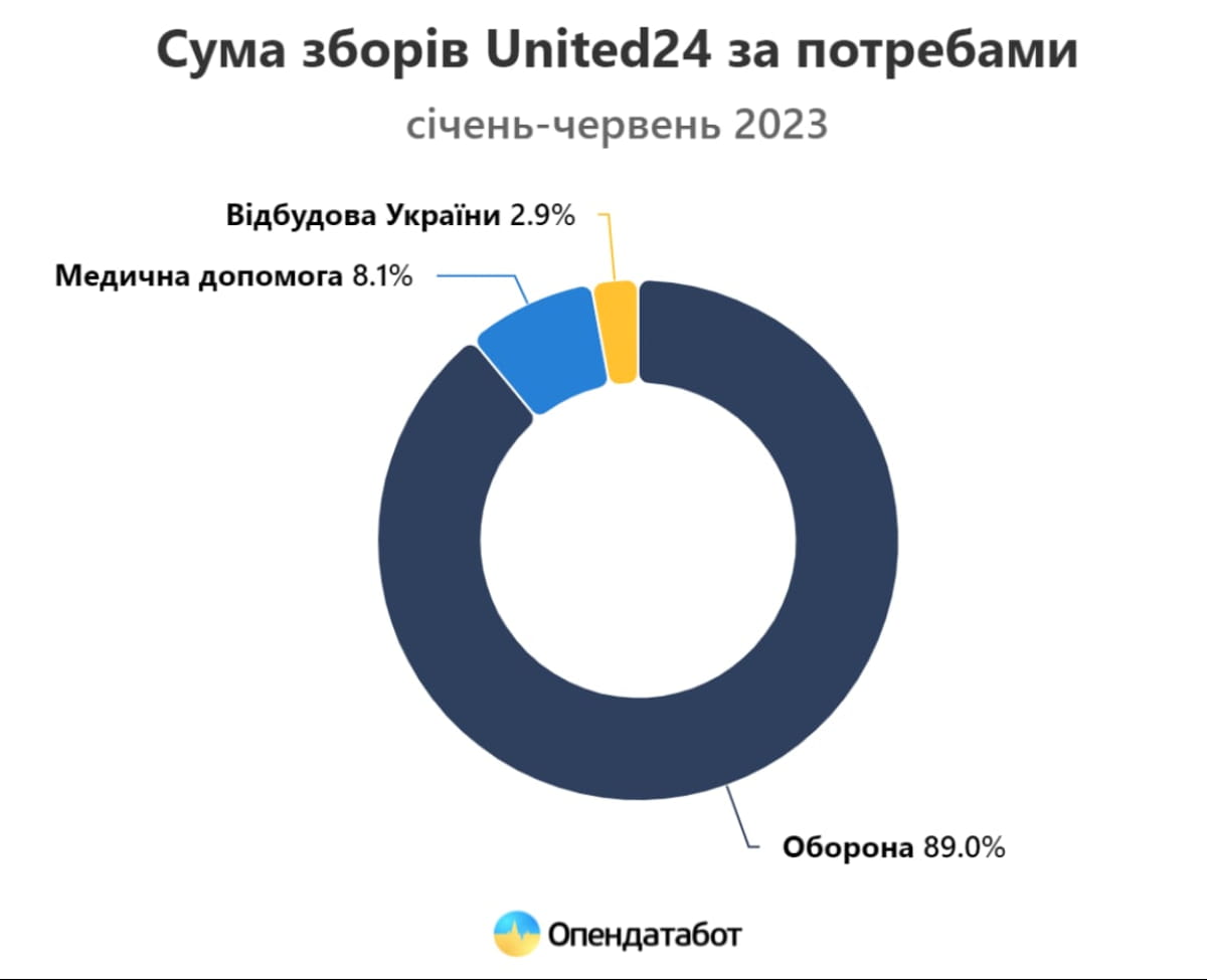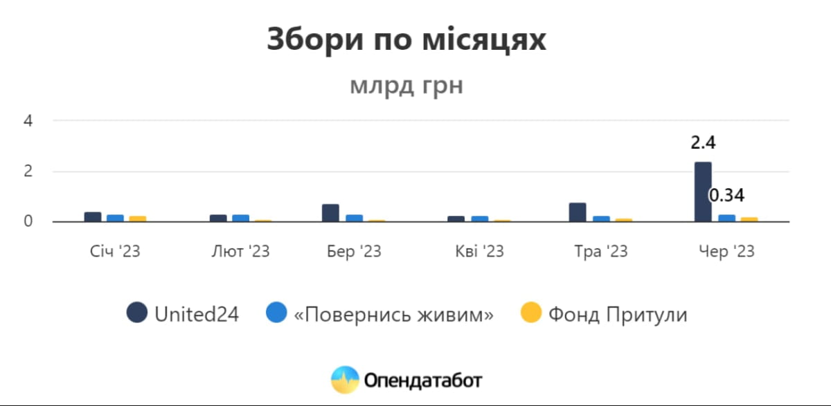 За червень-2023 на рахунок найбільших благодійних фондів України надійшло понад 8 млрд грн. Найбільшу кількість донатів зібрали платформа United24, благодійний фонд "Повернись живим" і фонд Сергія Притули.