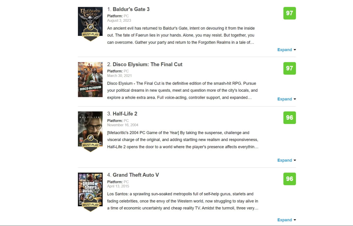 Своєю чергою, на Metacritic проєкт обігнав у рейтингу найкращих ПК-тайтлів Disco Elysium: The Final Cut. Втім, обидві відеоігри мають однакову кількість балів – по 97 зі 100.