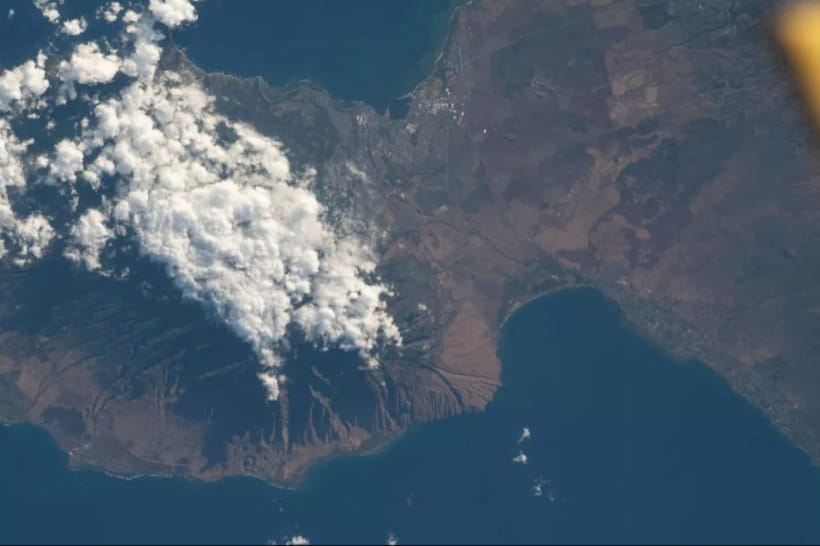 Оприлюднені знімки, які були зроблені 12 серпня з борту МКС, показують гавайський острів Мауї через чотири дні після початку лісових пожеж. Фотографії були зроблені з висоти 259 миль (417 км) над Тихим океаном.