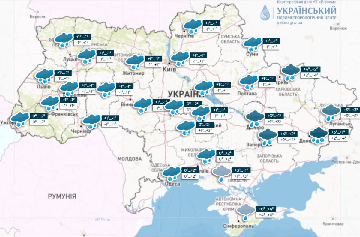 Середня температура повітря цього дня становитиме -1...+1°С. На Сході дещо тепліше – до +5°С у денний час. На дорогах місцями можлива ожеледиця.