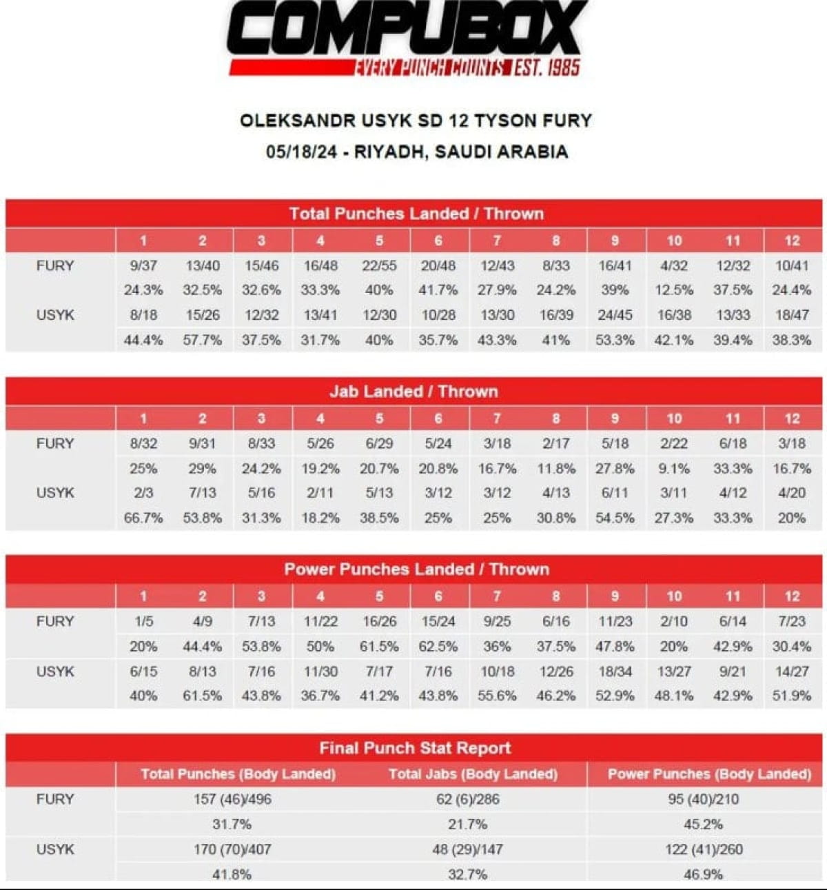 Ресурс Compubox надав детальний аналіз поєдинку. Упродовж 12 раундів бою Усик здійснив 407 ударів, з яких 170 були влучними. Зокрема, він влучив 48 разів зі 147 джебів та 122 рази із 260 ударів по корпусу.