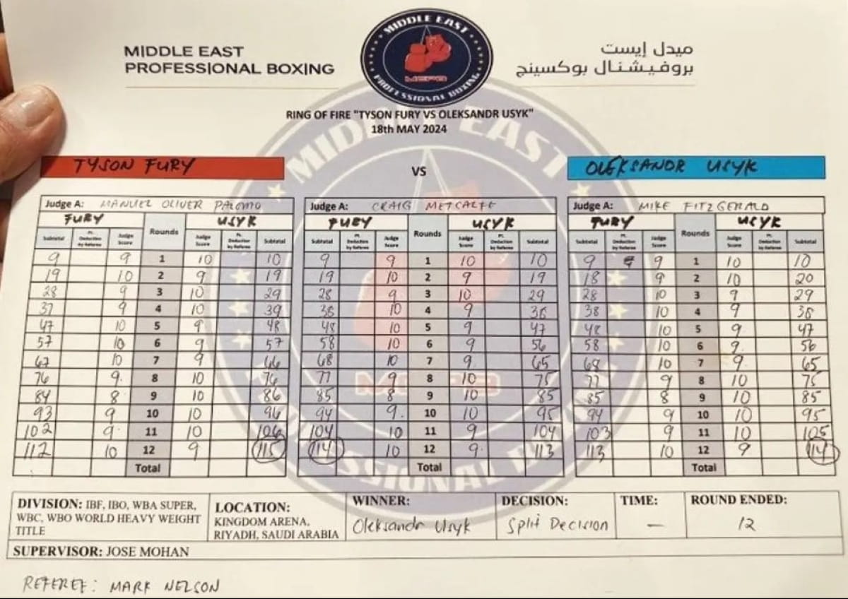 Усик здобув перемогу над Ф'юрі роздільним рішенням суддів – 114:113, 113:114, 115:112. Суддівські записки були опубліковані інсайдером Деном Рафаелем.