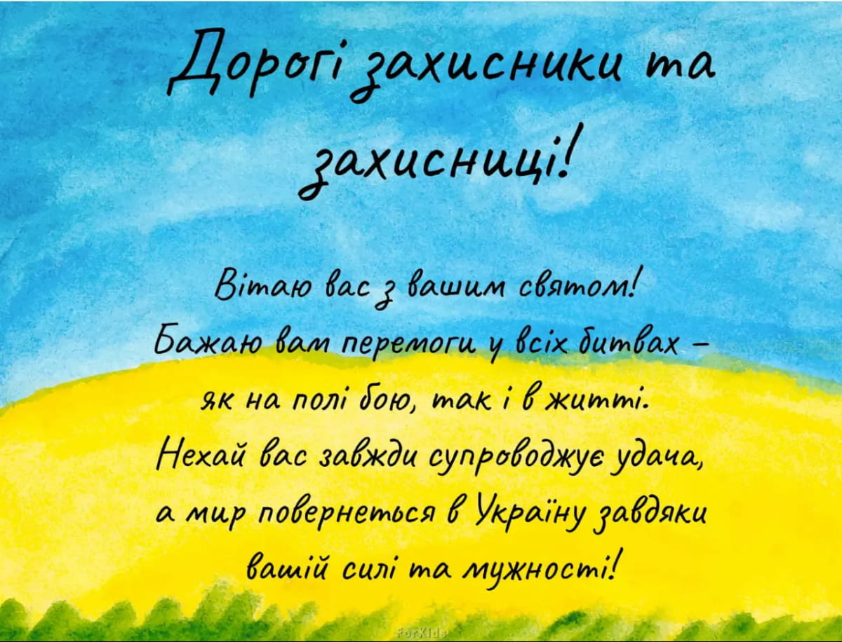 Вітаю з великим святом – Днем захисників та захисниць України! Дякую за твою відвагу, безстрашність та патріотизм Цього дня хочу від щирого серця побажати тобі віри, миру, стійкості та мужності. Нехай тебе ніколи не залишає успіх і добро!