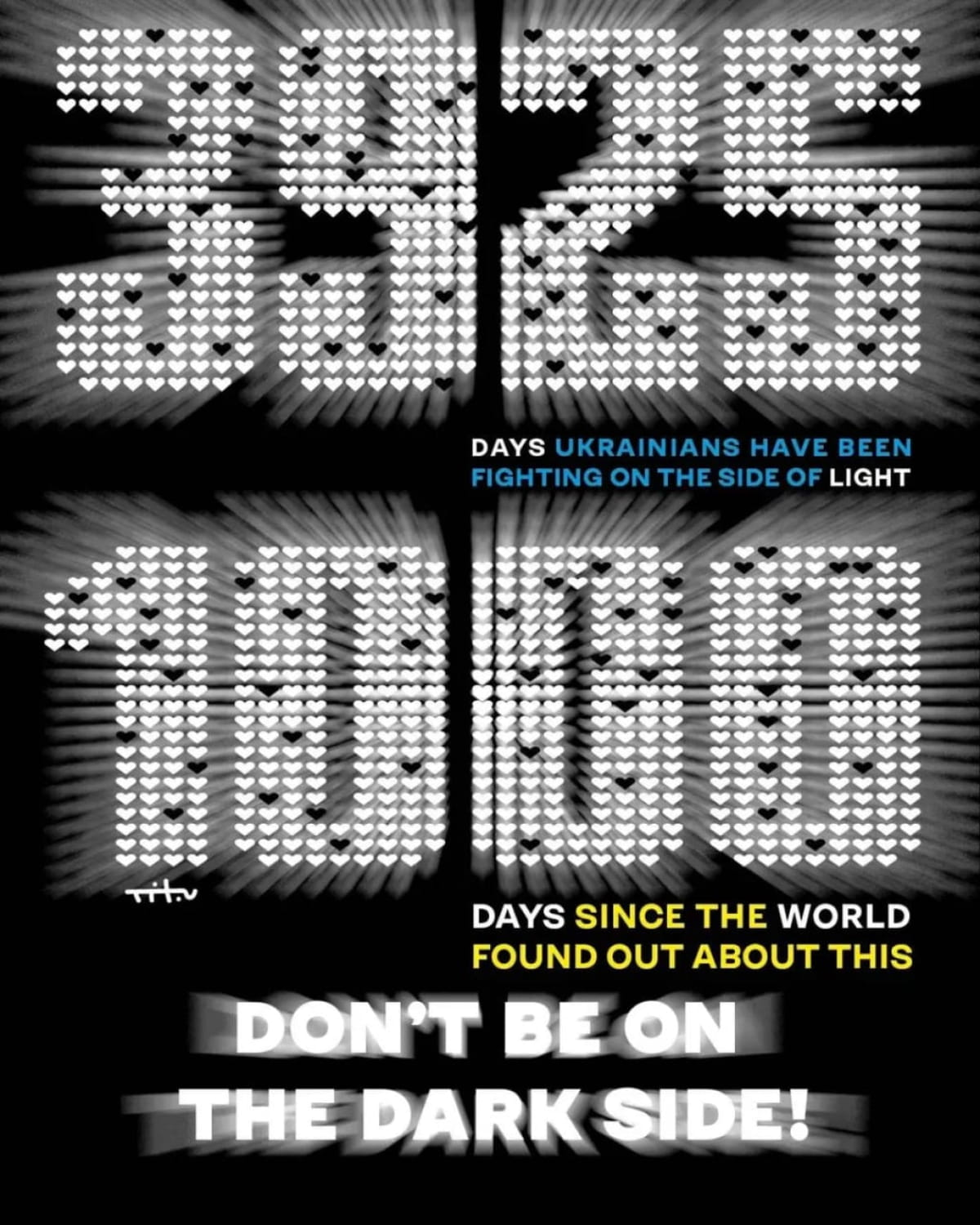 "3925 днів українці ведуть боротьбу на стороні світла, 1000 днів як світ дізнався про неї. Не будь на темній стороні", – йдеться на його плакаті.