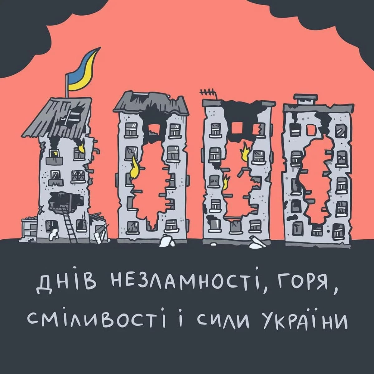 "1000 днів незламності, горя, сміливості та сили України… Реальність така, що до існуючої ілюстрації домальовую ще один нуль. Сьогодні 1000 днів з моменту повномасштабного вторгнення росії в Україну"