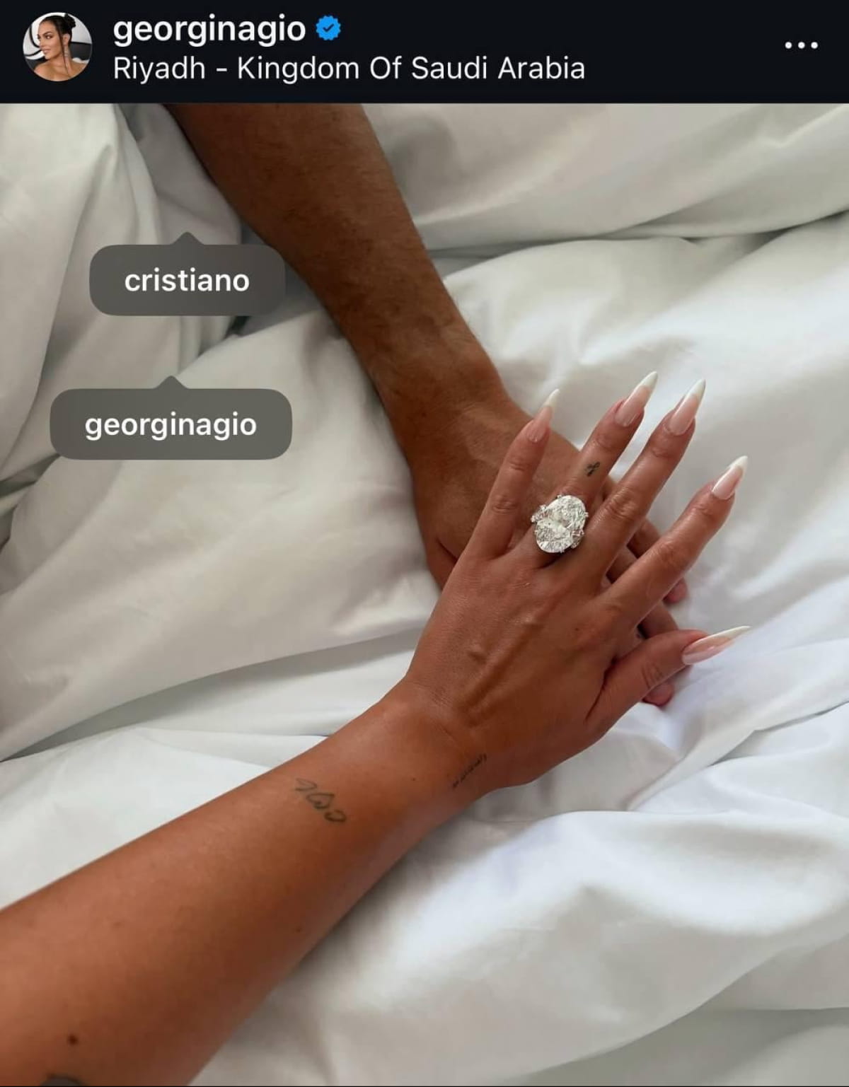 Вона опублікувала зворушливий кадр: на фото її рука з каблучкою на безіменному пальці ніжно лежить на руці Роналду. Лаконічний підпис до знімка звучав так: