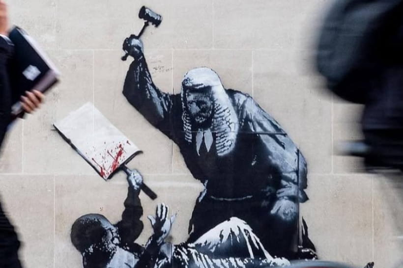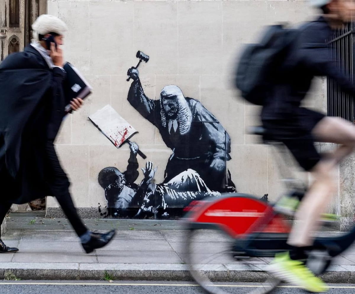 Відомий стріт-арт художник Бенксі здивував своїх прихильників новим малюнком. Його помітили 8 вересня на фасаді Королівського суду в Лондоні. Однак місце його розташування змусило поліцію звернути на нього увагу. Того ж дня його накрили плівкою та загородили металевою огорожею.