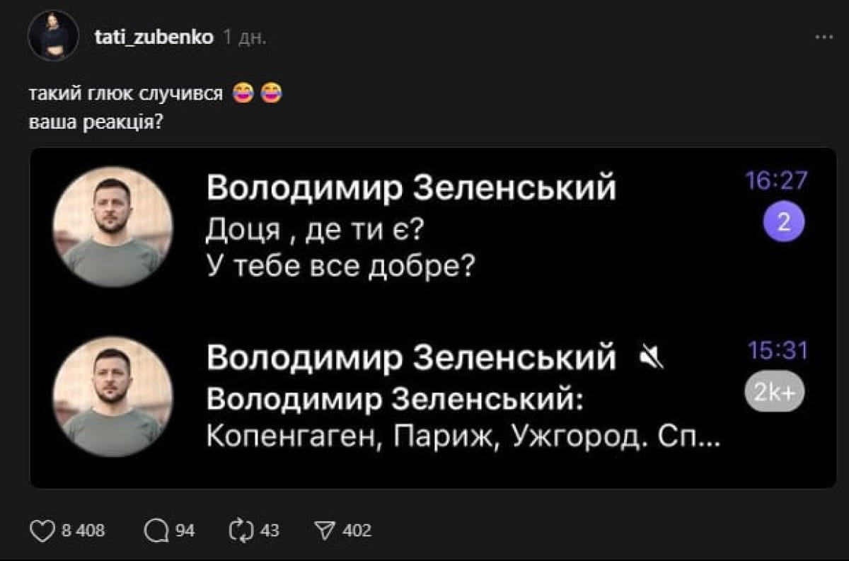 Дівчині з України, яка зараз проживає в Польщі, прийшло "повідомлення" від президента України Володимира Зеленського. Річ у тім, що в месенджері відбувся збій. Про це повідомляє "Дивогляд" із посиланням на допис дівчини.