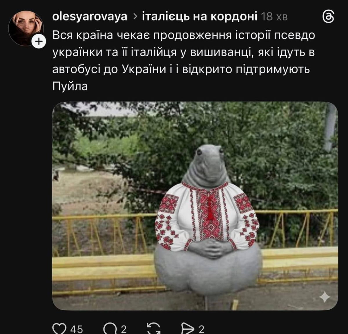 Український сегмент мережі Threads сколихнув гучний скандал, головним героєм якого став громадянин Італії на ім’я Рокко. Чоловік, який прямував автобусом до України, публічно висловлював підтримку російському диктатору та зневажливо відгукувався про українську державу. Інцидент набув такого розголосу, що ситуацію взяли під контроль прикордонники та Служба безпеки України, повідомляє "Дивогляд".