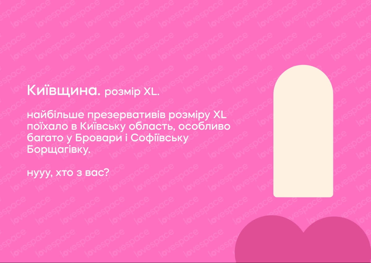 Київщина стала лідером за замовленнями презервативів розміру XL – найбільше покупок зафіксовано в Броварах та Софіївській Борщагівці. А от у самому Києві цікава тенденція: 67% замовлень припало на лівий берег, який у підсумку виявився "сексуально активнішим" за правий.