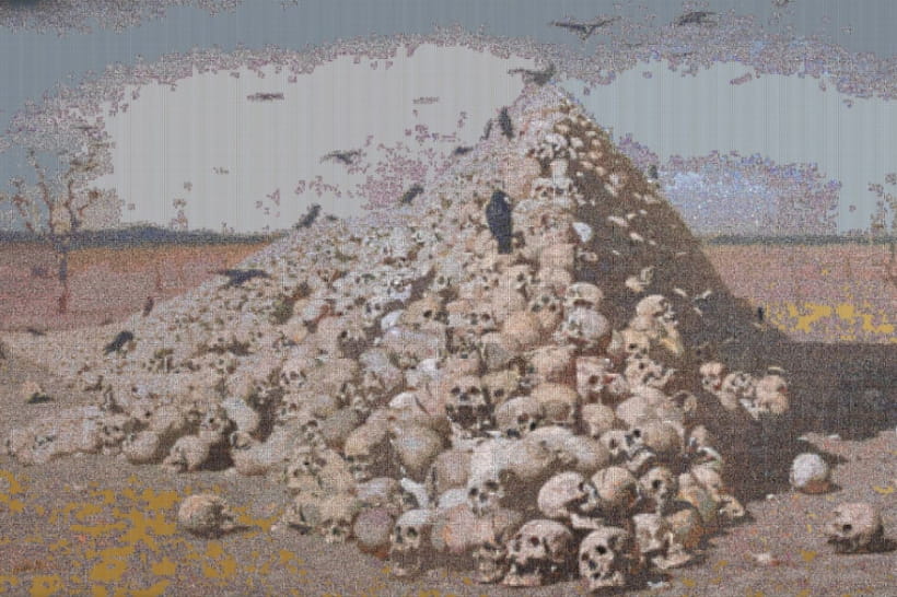 На перший погляд, відвідувач сайту бачить знамените полотно Василя Верещагіна "Апофеоз війни", проте у дещо розмитій якості. Але це не технічна помилка. Якщо масштабувати зображення, стає зрозуміло, що воно є велетенською мозаїкою, яка складається з 200 186 пікселів.