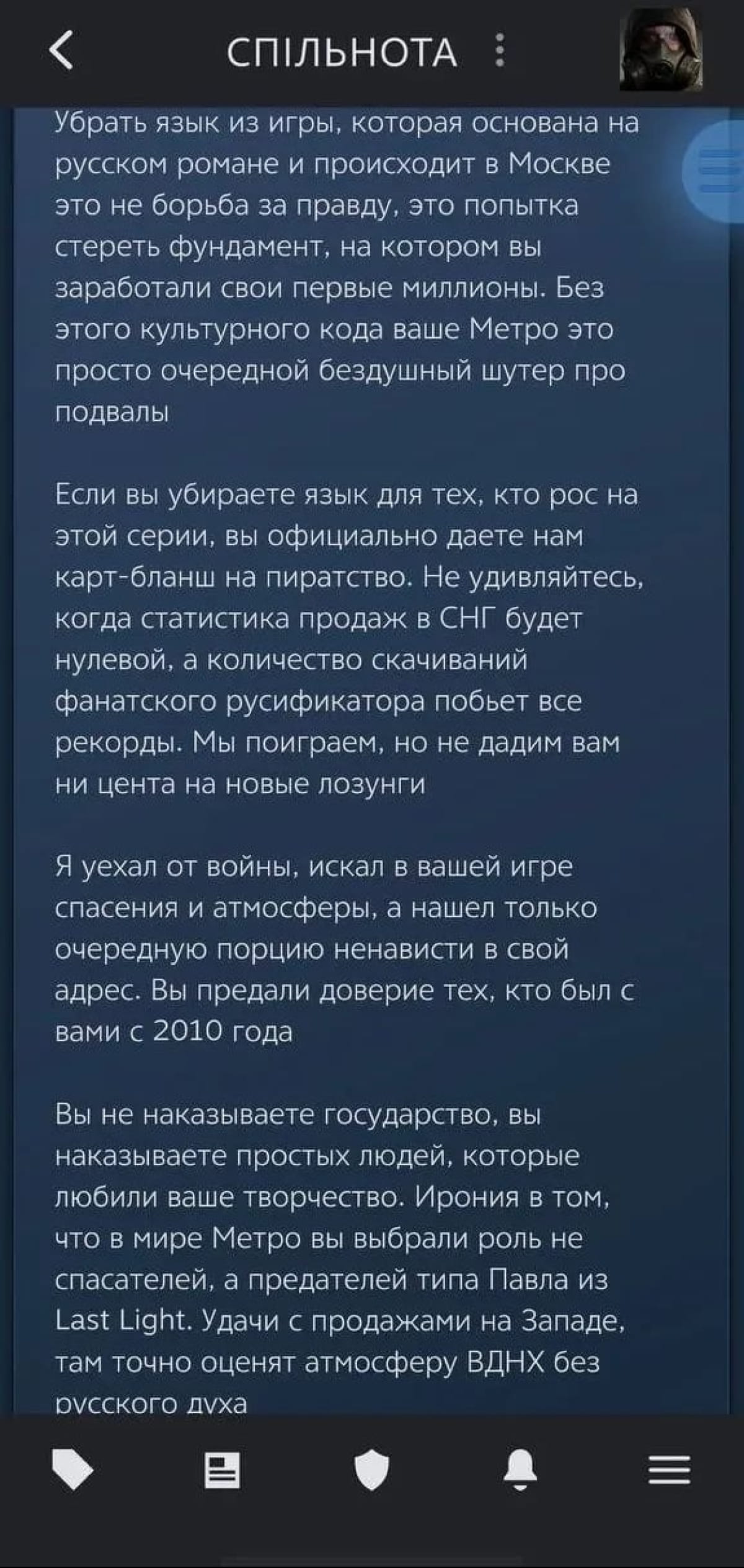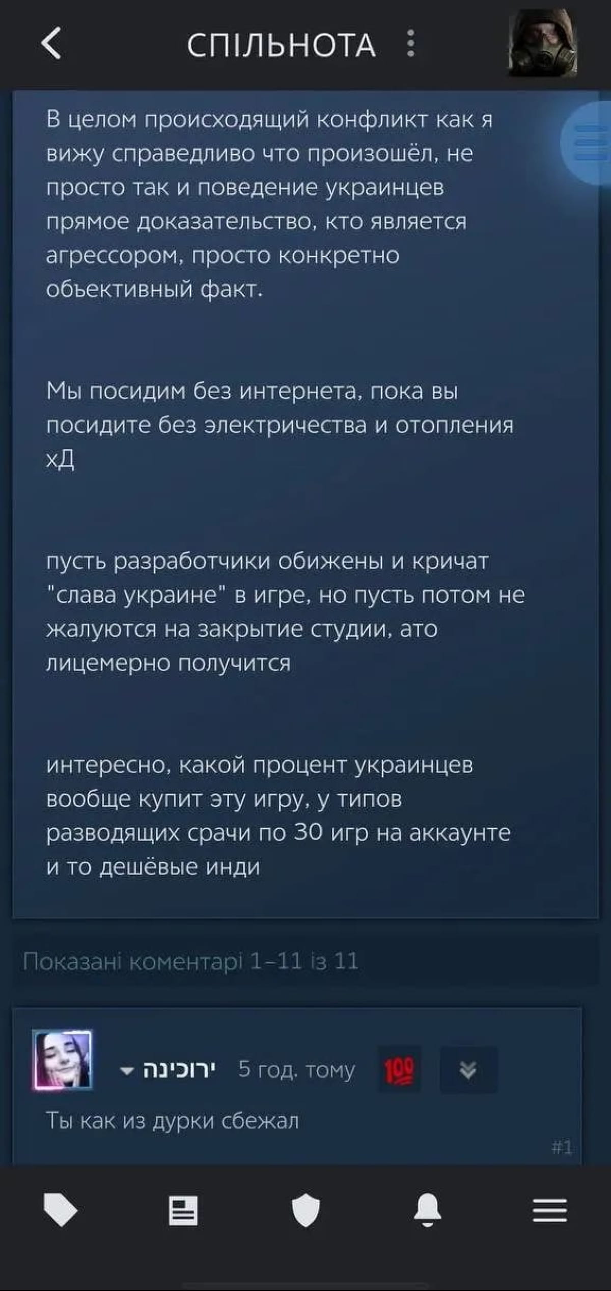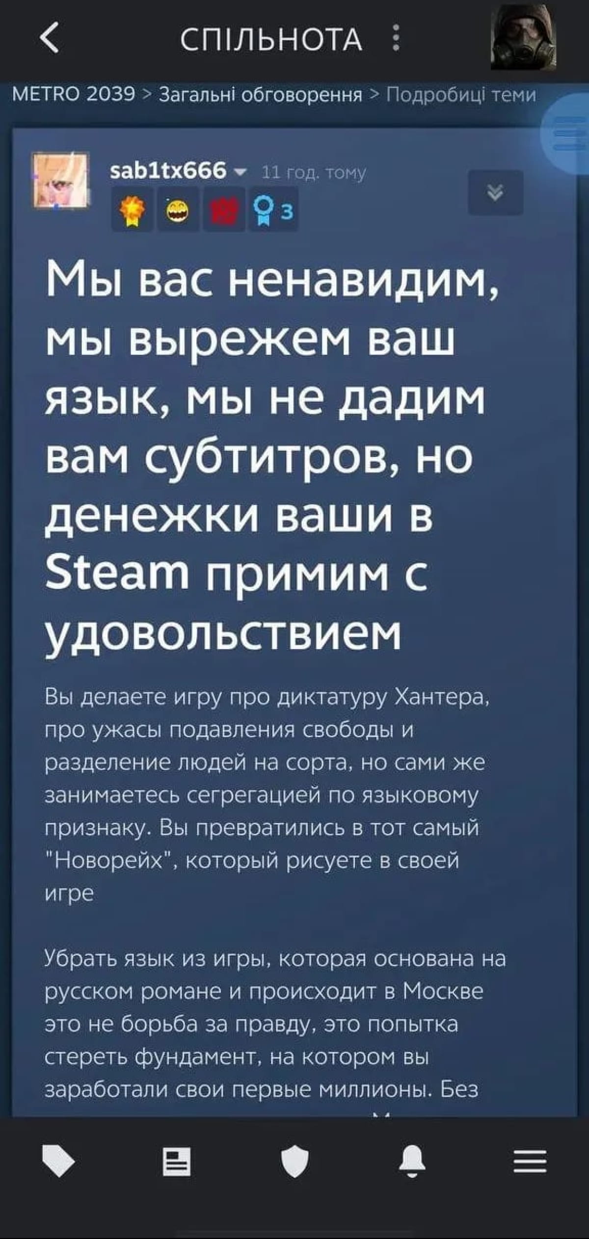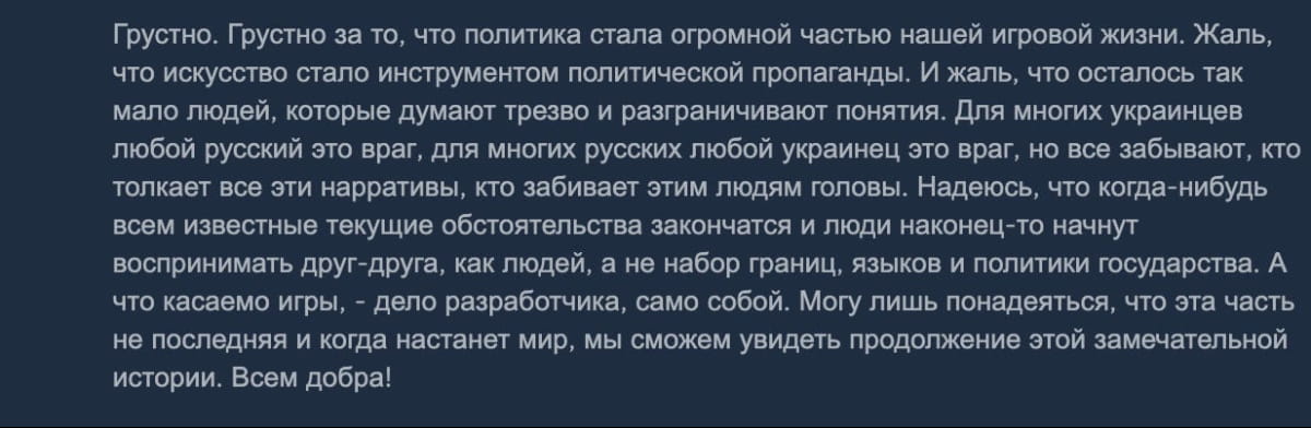 Колективна істерика: У Steam створено понад 300 тем, де росіяни вимагають додати локалізацію, звинувачуючи розробників у "зраді власної творчості" та "політичній пропаганді".