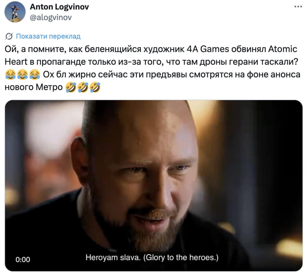 Скандування гасел: Окрему лють викликав той факт, що під час презентації українські розробники виголосили гасло "Слава Україні! Героям слава!".