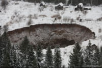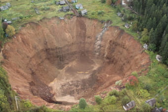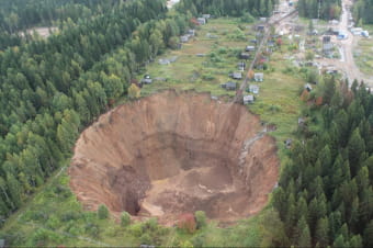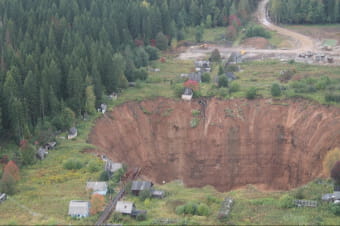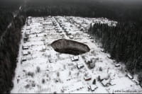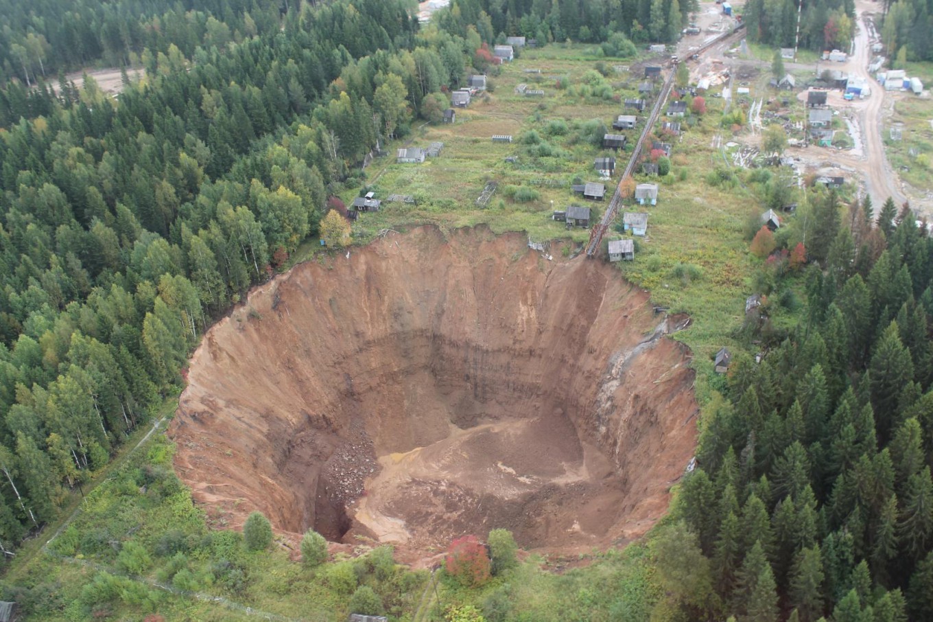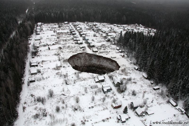 Житлова забудова у місті Солікамськ продовжує провалюватись під землю – воронка перевищила 120 метрів у діаметрі.
