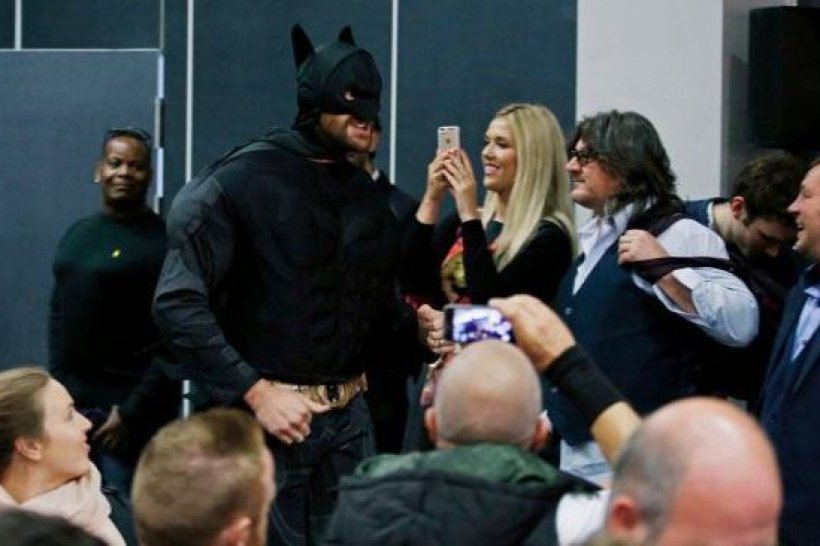 Британець Тайсон Ф'юрі вразив усіх, хто був у залі, адже з'явився на зустріч у костюмі Бетмена, пише сайт фан-клубу братів Кличко.