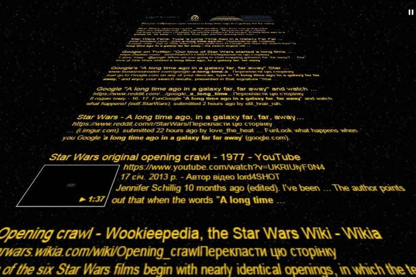Щоб сюрприз "спрацював", потрібно ввести в пошуковому рядку браузерів Chrome або Safari "a long time ago in a galaxy far far away" .
