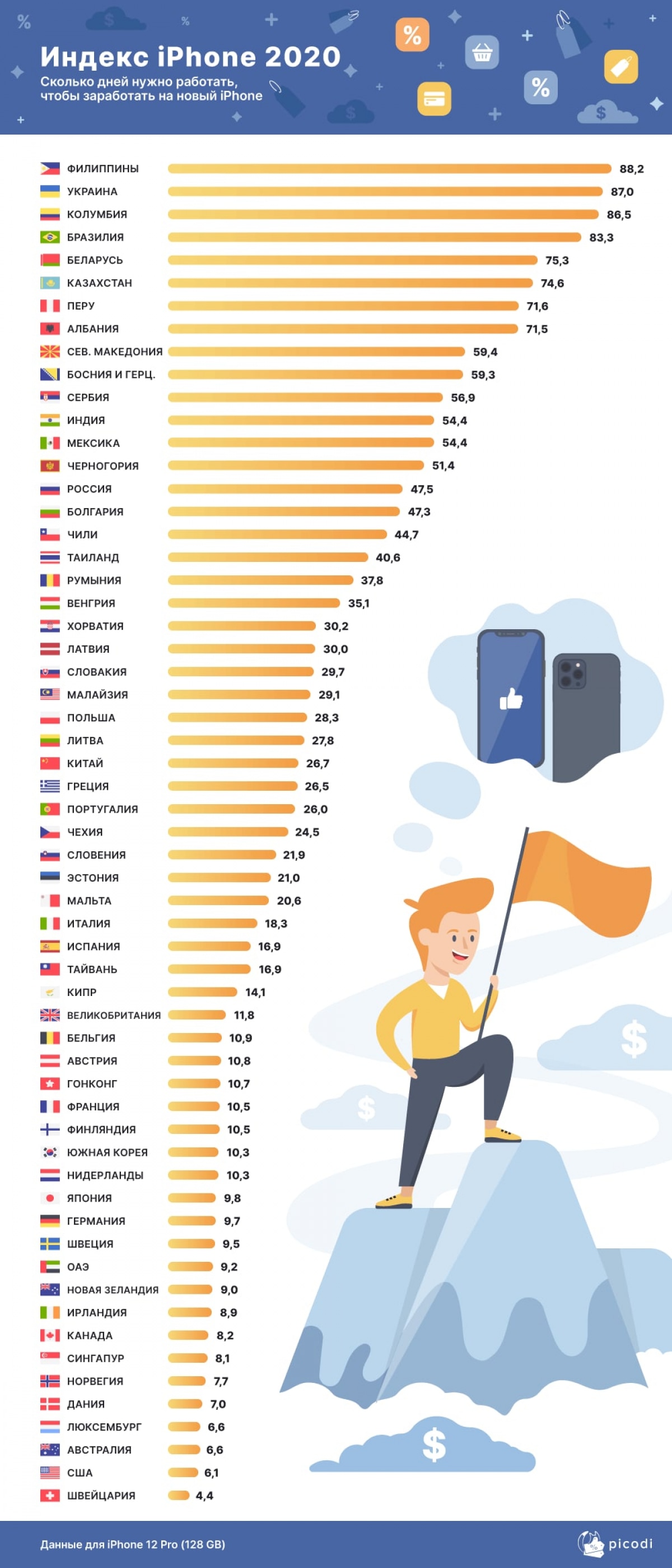 И, если сравнить Украину с другими странами, оказывается, что хуже ситуация, чем у нас, только на Филиппинах. Там для приобретения iPhone 12 Pro надо 88,2 чистых рабочих дней.
