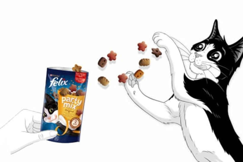 Доступны "Вкусные моменты" с курицей или лососем и Felix® Party Mix®, которые содержат А, D3, Е и Омега-6 жирные кислоты, много протеина. В каждой упаковке миксов – целых три мясных или рыбных ингредиента. Форма же таких снеков может быть разной: подушечки, звездочки, палочки, полоски.