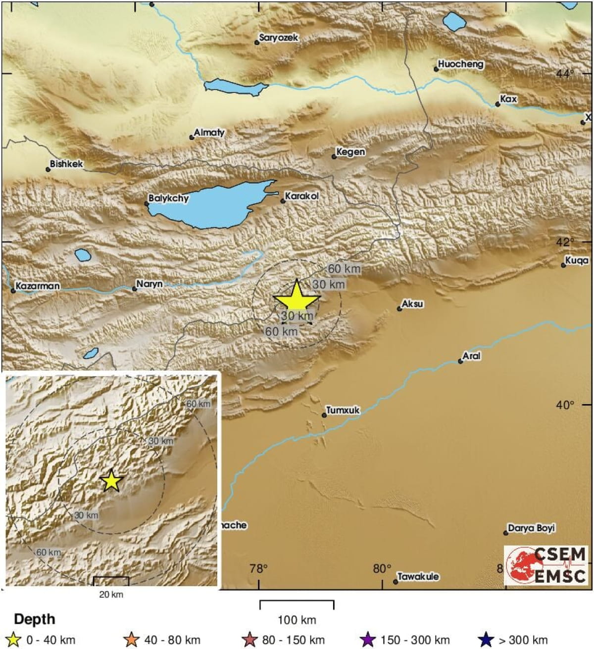 В Европейско-средиземноморском сейсмологическом центре (EMSC) утверждают, что подземные толчки зафиксировали в 6:27 утра по местному времени в 276 км к юго-востоку от Алма-Аты и в 125 км к западу от города Аксу, где проживает 535 тысяч человек.