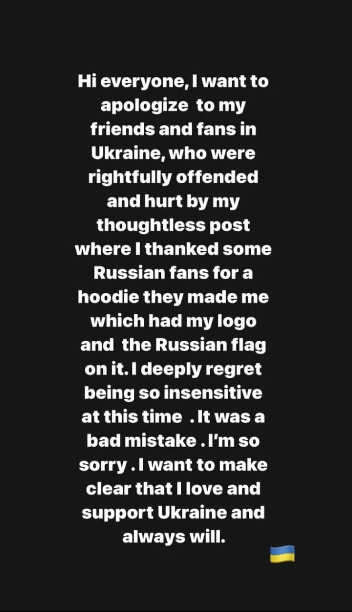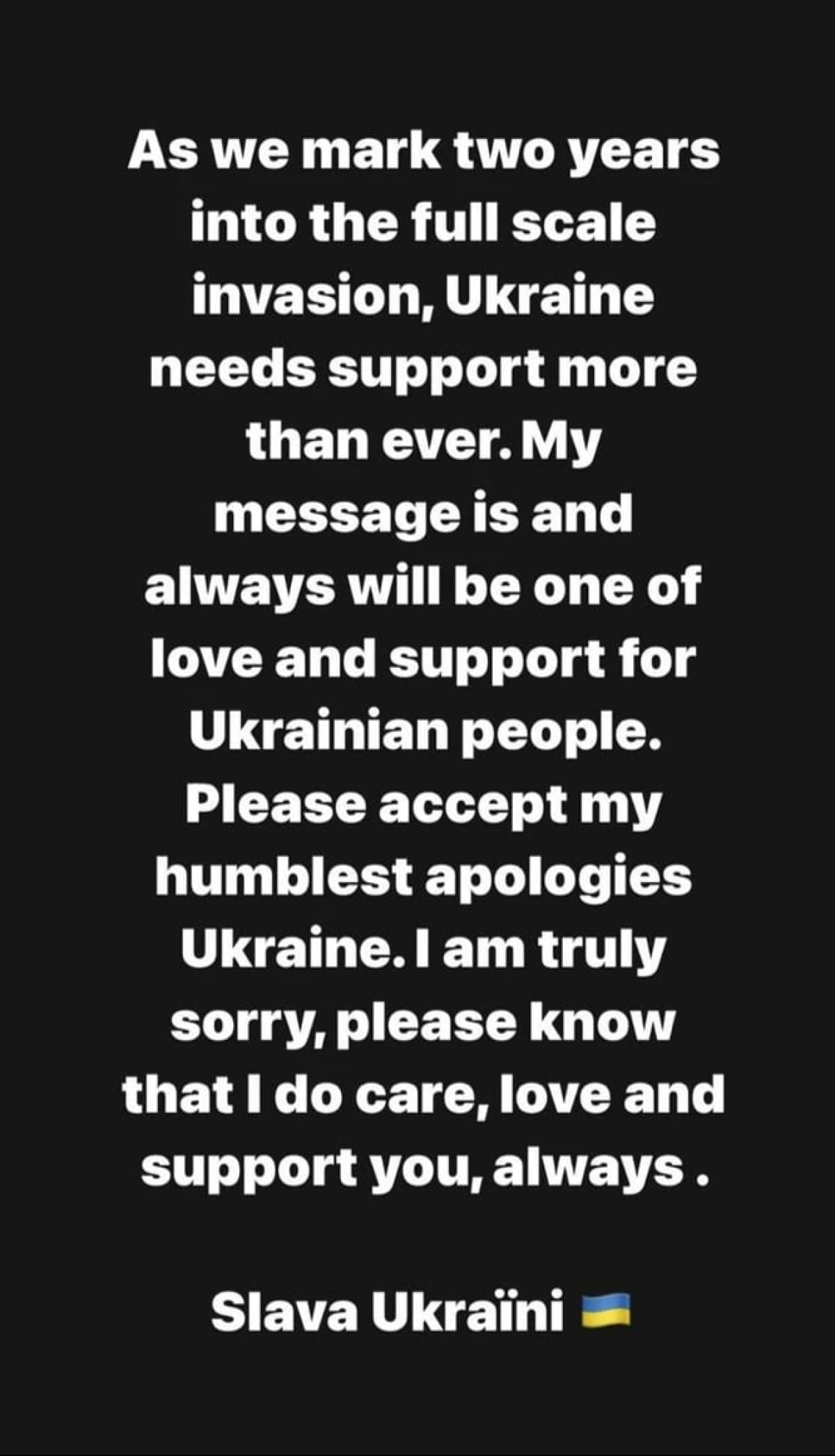 "Привет всем, я хочу извиниться перед моими друзьями и поклонниками в Украине, которых справедливо обидел и задел мой бездумный пост, в котором я благодарила некоторых русских фанатов за худые, которую они мне сделали, с моим логотипом и русским флагом.