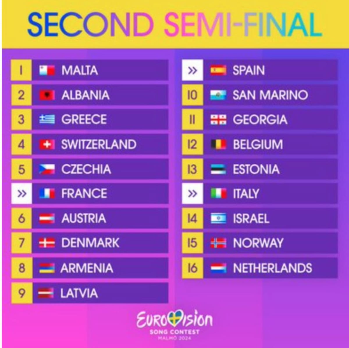 В рамках второго полуфинала на сцену выйдут представители 16 стран, которые будут бороться за выход в финал конкурса. Также в этом полуфинале примут участие три страны-основательницы Евровидения – Франция, Испания, Италия.