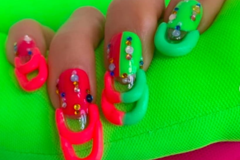 Мэй соединила два неоновых цвета: розовый и салатовый, а из пластика сделала ручки для "сумочки" на ногтях.