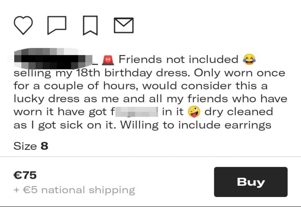 В описании к одежде анонимная пользовательница также отметила, что перед продажей она отдала одежду в химчистку, поскольку однажды ее стошнило в платье. Она добавила, что готова подарить покупателю серьги, которые надевала вместе с указанной вещью.