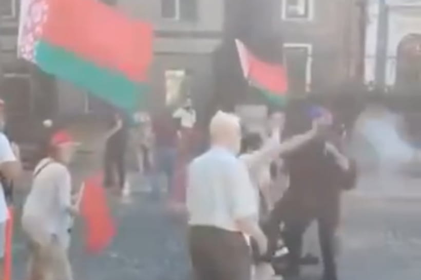 На видеофрагменте можно увидеть, как несколько человек подошли к объединению людей с флагами Беларуси, которые стояли напротив посольства, и брызнули им в глаза газом. Среди пострадавших были люди пожилого возраста.