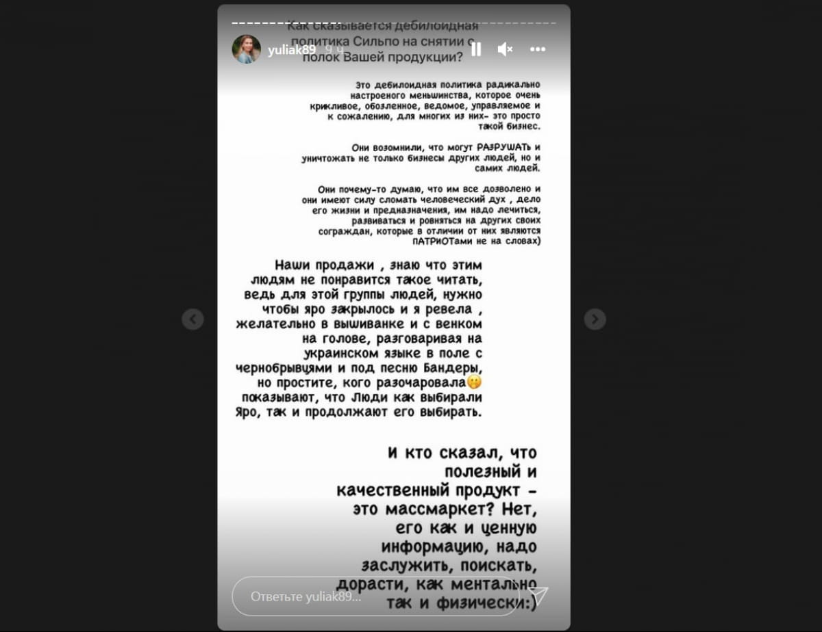 "Для этой группы людей нужно, чтобы яро закрылась, а я ревела желательно в вышиванке и с венком на голове, разговаривая на украинском языке в поле с бархатцами и под песню Бандеры, но простите, кого разочаровала", - отметила предпринимательница.