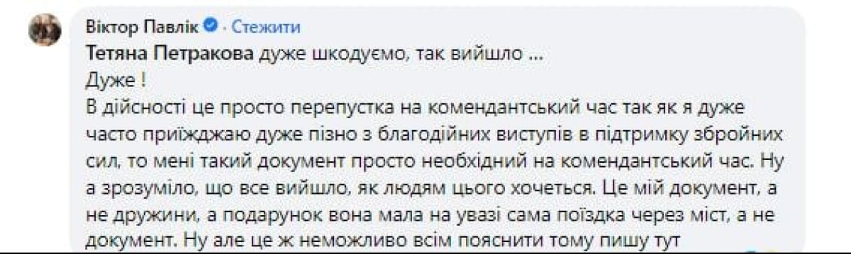 Впоследствии появился комментарий от самого Павлика, который написал, что имеет пропуск на комендантский час, потому что он часто возвращается с благотворительных концертов в поздний час.