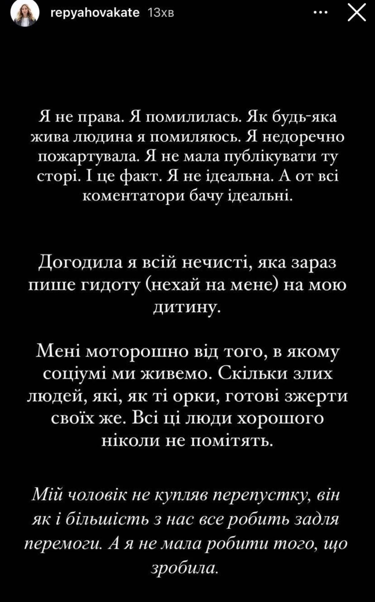 "Я не права. Я ошиблась. Как любой живой человек я ошибаюсь. Я неуместно пошутила. Я не должна была публиковать ту историю. И это факт. Я не идеальна. А вот все комментаторы вижу идеальные. Угодила я всей нечисти, которая сейчас пишет гадость (пусть по мне) на моего ребенка. Мне жутко от того, в каком социуме мы живем. Сколько злых людей, которые, как те орки, готовы сожрать своих же. Все эти люди хорошего никогда не заметят. Мой муж не покупал пропуск, он, как и большинство из нас, все делает для победы. А я не должна была делать того, что сделала", – написала она.