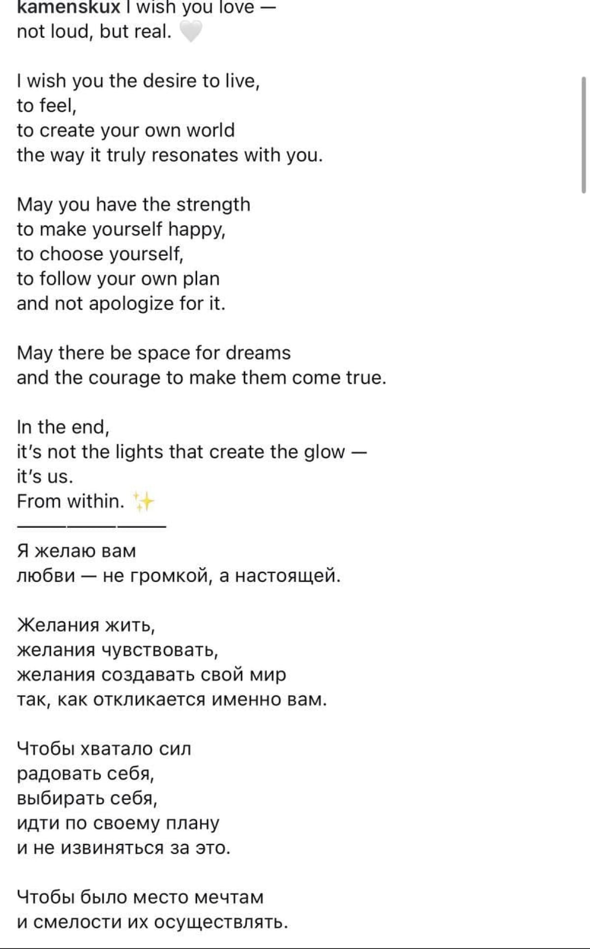 "Я вирішила більше нічого не відкладати і не сумніватися. І найголовніше – не боятися. NK відкриває нову сторінку свого життя. Без гучних обіцянок, просто з відкритим серцем. Для всіх, хто захоче йти далі разом зі мною"