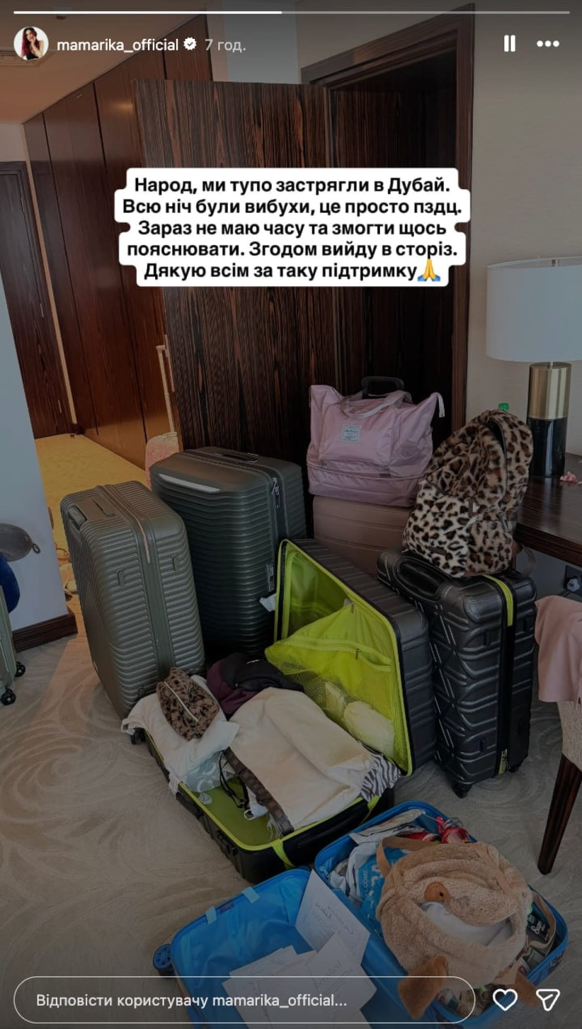 "Народ, ми тупо застрягли в Дубаї. Всю ніч були вибухи. Зараз не маю часу та змоги щось пояснювати. Згодом вийду в сторіз. Дякую всім за таку підтримку"