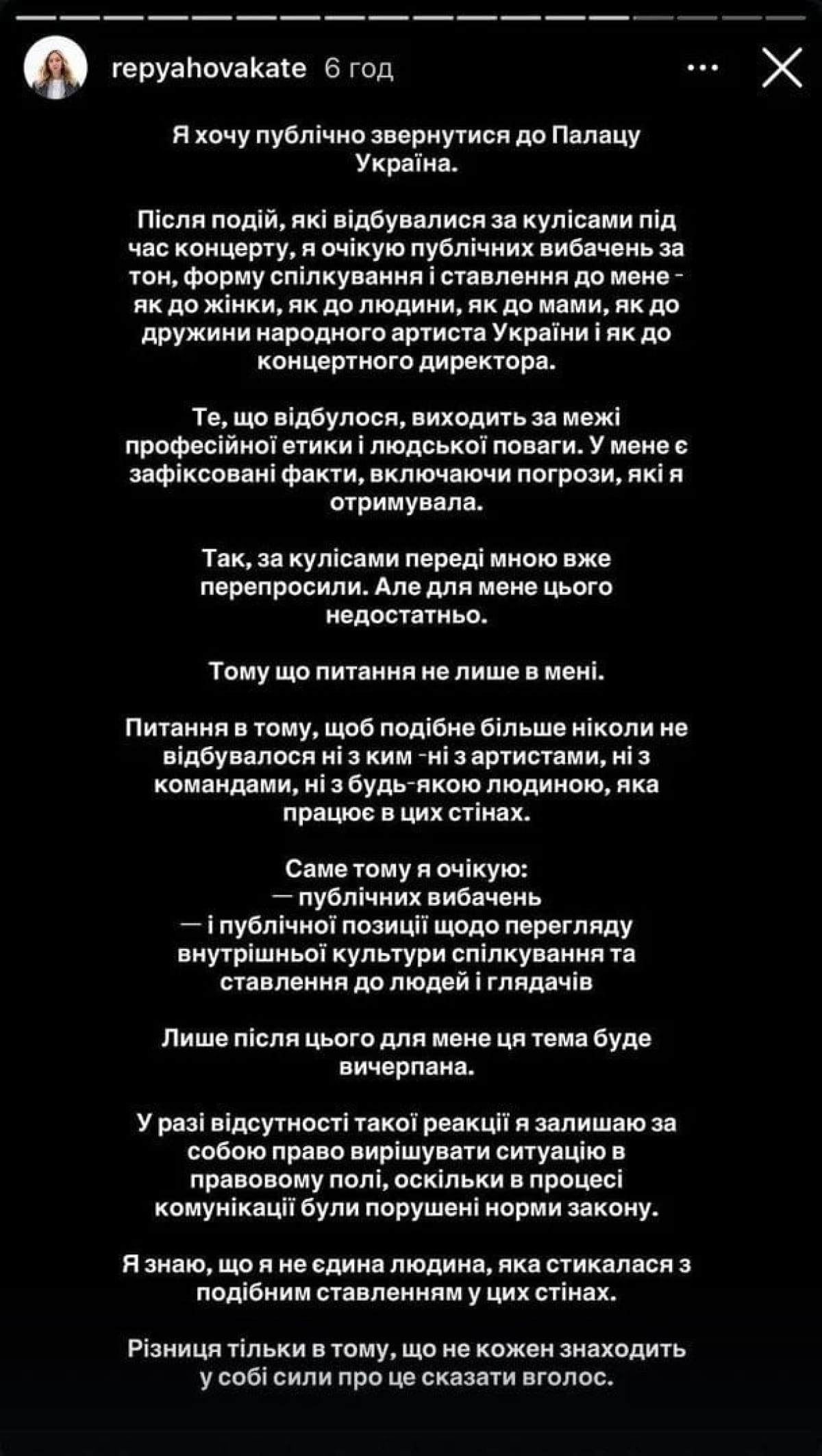 "Після подій, які відбувалися за лаштунками під час концерту, я очікую публічних вибачень за тон, форму спілкування і ставлення до мене як до жінки, як до людини, як до мами, як до дружини народного артиста України і як до концертного директора. Те, що відбулося, виходить за межі професійної етики і людської поваги. У мене є зафіксовані факти, включаючи погрози, які я отримувала", – наголосила директорка.