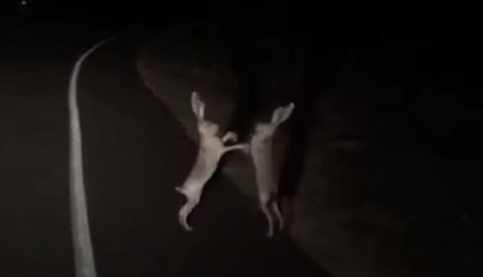 "Будь як Кличко": Туристи зафільмували на нічній дорозі спаринг двох зайців