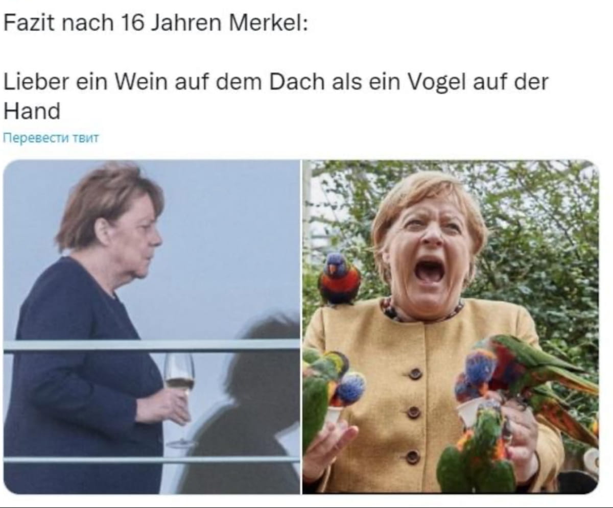"Висновки після 16 років керівництва Меркель: краще вино на даху, ніж пташка у руці", – йшлося у дописі до одного з них.