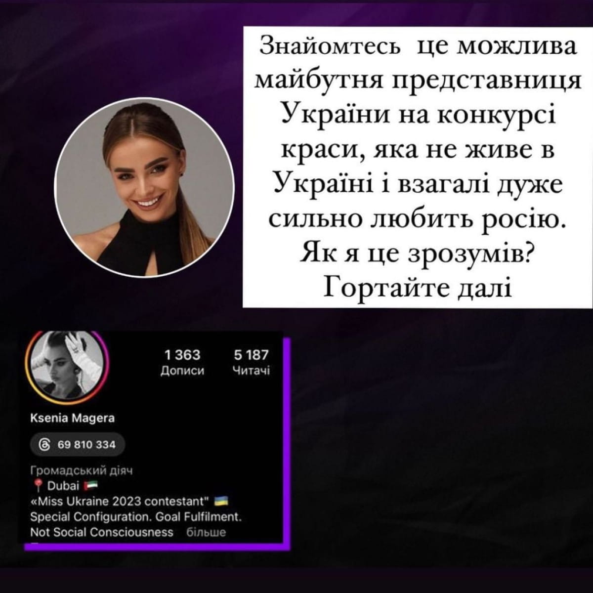 Артист пише, що до 2022 року конкурсантка №10 Оксана Магера з Хмельницької області була мешканкою москви і навіть учасницею конкурсу "Майбутнє росії". Її соцмережі не містять згадки про повномасштабну війну проти України. Про це повідомляє "Дивогляд" із посиланням на його Instagram.