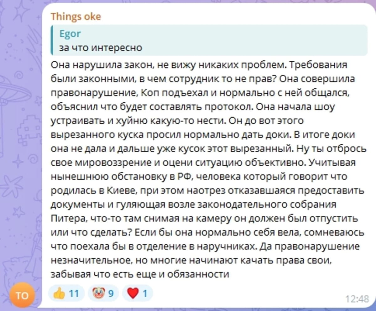 За словами самої Маламан, інцидент у Санкт-Петербурзі стався після того, як вона повідомила патрульному поліцейському місце свого народження – столицю України. На відео, яке блогерка встигла опублікувати у своєму Telegram-каналі, зафіксовано розмову з правоохоронцями.