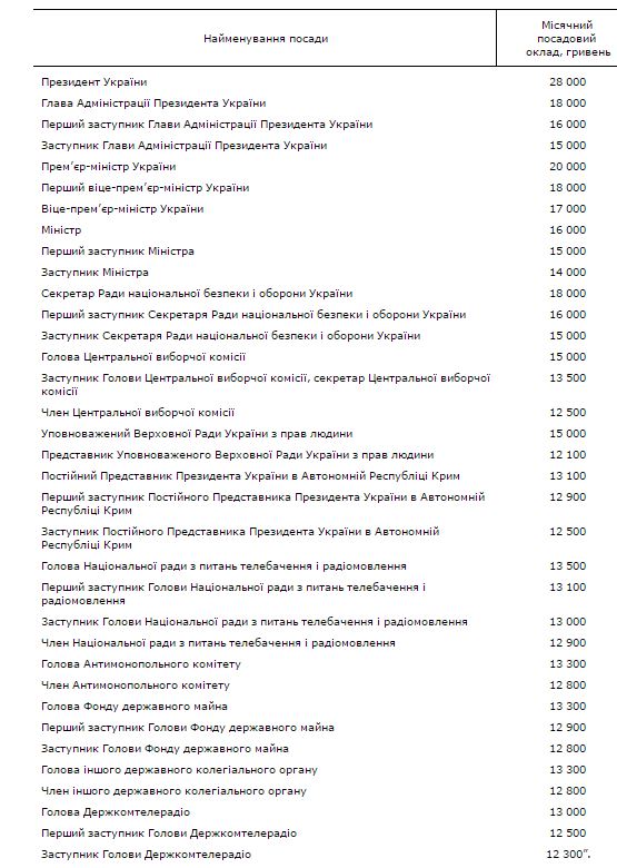 Так, оклад Президента України затверджено на рівні 28 тис. грн, прем'єр-міністра – 20 тис. грн, першого віце-прем'єра – 18 тис. грн, віце-прем'єра – 17 тис. грн.