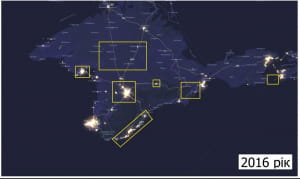 Разом з тим супутникові знімки зафіксували найменше зниження рівня освітленості для населених пунктів, в яких розміщені об'єкти Чорноморського флоту і ЗС Росії (Севастополь, Феодосія, Джанкой, Новофедорівка) і в районі будівництва Керченського мосту (острів Тузла).