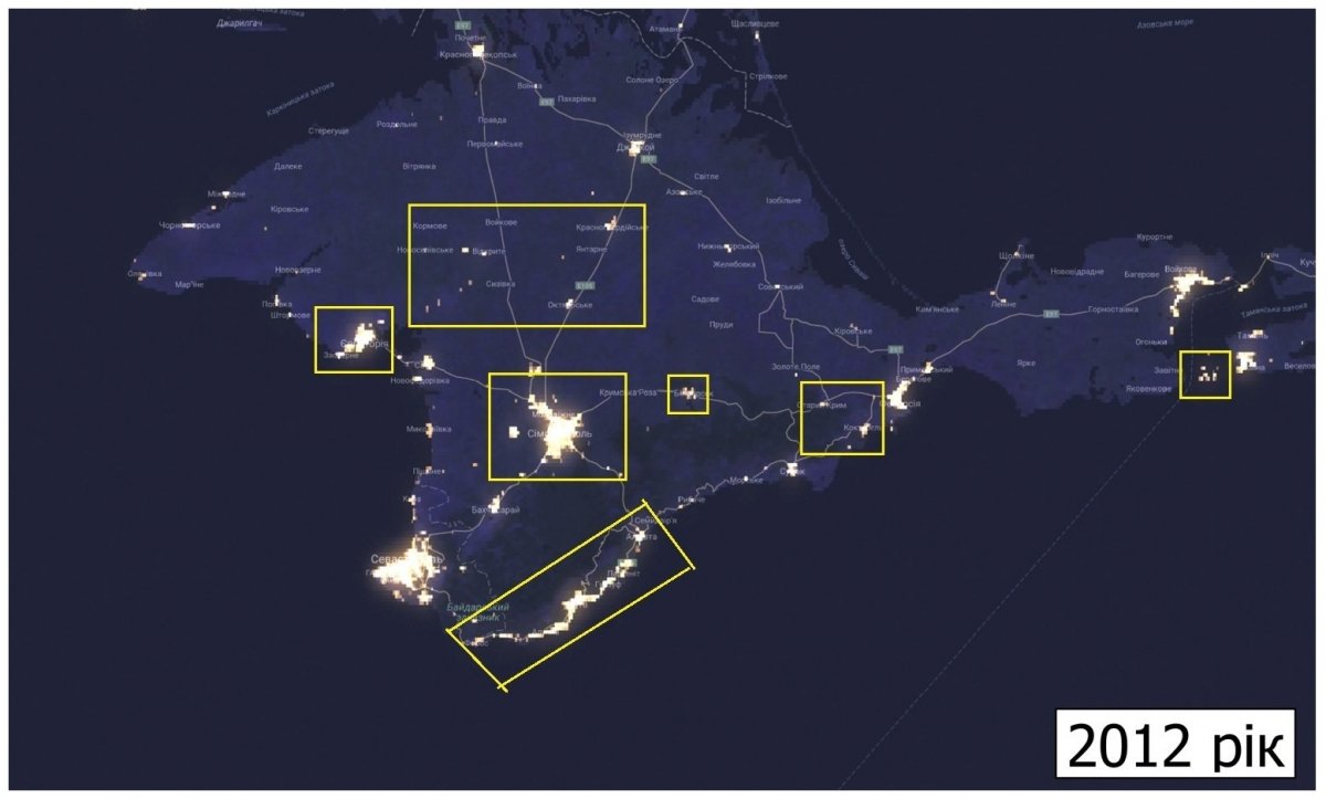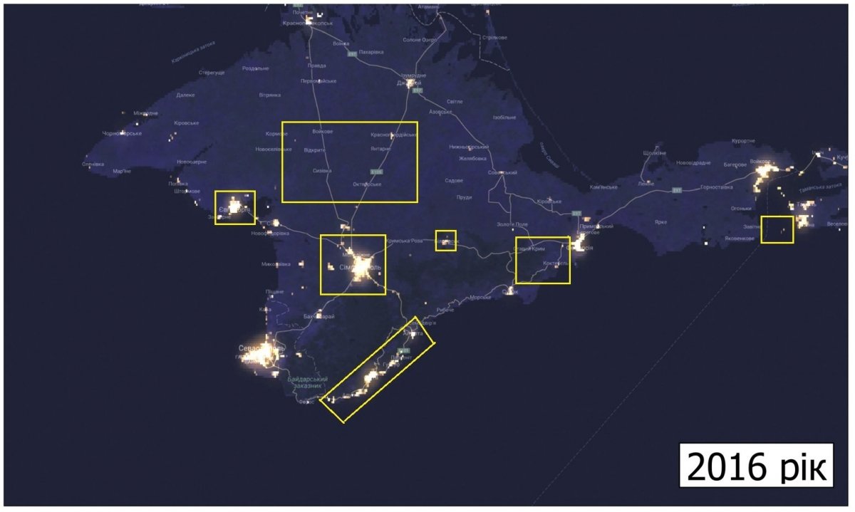 "Загалом на території тимчасово окупованого півострова рівень освітленості знизився на 26%. Найбільш видиме зниження рівня освітленості можна спостерігати для центральних районів АР Крим та для населених пунктів орієнтованих на надання лікувально-курортних послуг (Ялта, Алушта, Євпаторія - Заозерне)", – йдеться у повідомленні.